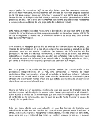 Internet ha superado la capacidad de los medios de comunicación tradicionales para informar de manera rápida. Ahora, la gente puede crear sus propios espacios en internet para compartir información y opiniones. Esto plantea retos para el periodismo, que debe adaptarse a las herramientas multimedia e innovadoras de internet para mantener la atención de los lectores.