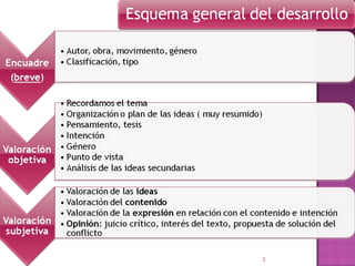 Este documento proporciona una guía para analizar y resumir textos. Se divide en 7 secciones que cubren la información sobre el autor y obra, clasificación del texto, plan ideológico, análisis de ideas secundarias, valoración de las ideas, valoración de la expresión, y juicio crítico. El objetivo es extraer la información clave del texto de manera ordenada y razonada.