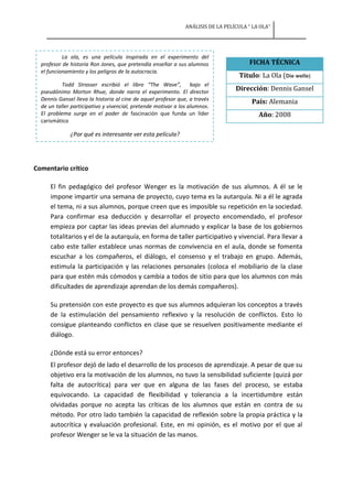 La película analiza el experimento de un profesor que intenta enseñar a sus alumnos sobre los peligros de la autocracia creando un movimiento autoritario en el aula. El profesor buscaba motivar a los estudiantes, pero pierde el control cuando el movimiento se vuelve demasiado poderoso. Aunque su intención era buena, el profesor no pudo reconocer que su enfoque estaba fallando y poniendo en riesgo a los estudiantes, mostrando la importancia de la autocrítica y la flexibilidad en la en