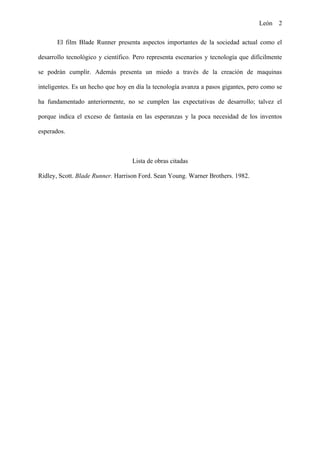 El documento resume la película Blade Runner, dirigida por Ridley Scott, y analiza dos de sus temas principales: la visión futurista que presenta la película y la posibilidad de crear máquinas inteligentes. También discute cómo la película representa los miedos humanos sobre la rebelión de las máquinas y el deseo de crear vida artificial. Si bien la película presenta una visión esperanzada del futuro tecnológico, la realidad no ha cumplido con esas expectativas.