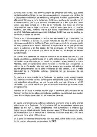 Este documento presenta un análisis detallado de un mapa sinóptico que muestra la situación meteorológica sobre la Península Ibérica. Se identifican varias masas de aire (frío del norte y cálido del sur) y sistemas de baja presión (incluyendo una sobre el centro de Europa y otra en el sureste de la península) que traerán inestabilidad atmosférica y precipitaciones. El tiempo se describe como típico del otoño en la península, con lluvias en