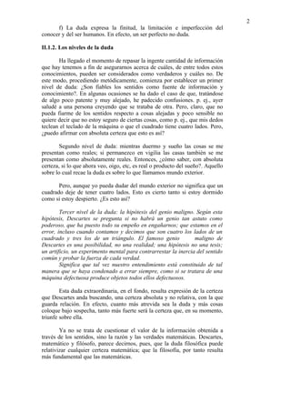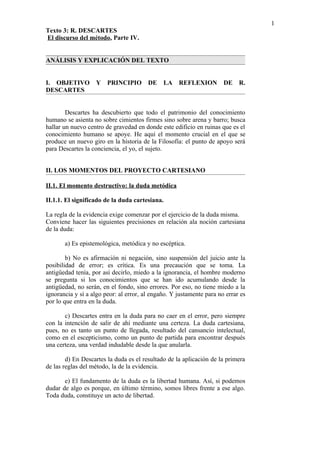 El documento resume los principales puntos del método filosófico de Descartes. En primer lugar, Descartes establece la duda metódica para cuestionar todo conocimiento previo y encontrar una certeza irrefutable. Luego, encuentra esa certeza en el famoso "pienso, luego existo", que demuestra la existencia del yo pensante. Finalmente, Descartes deduce la existencia de Dios y el mundo material a partir del yo pensante y Dios respectivamente.