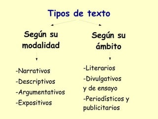 El documento ofrece un análisis de las diferentes modalidades de texto, incluyendo narrativos, descriptivos, argumentativos, expositivos y periodísticos. Detalla características y estructuras de cada tipo, así como ejemplos de textos narrativos de autores como García Márquez y otros. Además, se aborda el uso del lenguaje y los recursos literarios en distintos contextos textuales.