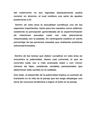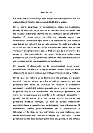 La edad adulta es una etapa de consolidación física y desarrollo cognitivo donde las personas aplican lo aprendido previamente en su contexto social, laboral y familiar. En esta etapa, las personas deben lograr una orientación vocacional y consolidar su identidad para formar una pareja. Existen varias opciones para la formación de pareja, como la soltería, la cohabitación o el matrimonio, cada una con ventajas y desventajas que deben considerarse cuidadosamente. La sexualidad y la paternidad también son aspectos importantes durante la ed