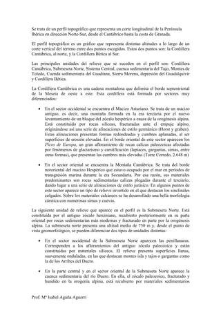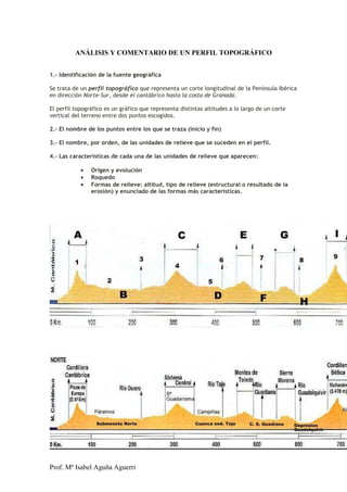 Este documento resume un perfil topográfico de la Península Ibérica de norte a sur. Describe las principales unidades de relieve, incluyendo la Cordillera Cantábrica, la Submeseta Norte, el Sistema Central, las cuencas sedimentarias del Tajo y Guadiana, los Montes de Toledo, Sierra Morena y las Cordilleras Béticas. Para cada unidad, explica su origen geológico, rocas dominantes y formas de relieve características.