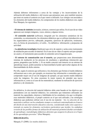 Los medios didácticos son recursos educativos que facilitan el proceso de enseñanza-aprendizaje al proporcionar información y organizar el conocimiento. Algunos ejemplos son libros de texto, videos e internet. Es importante seleccionar el medio didáctico correcto en función de los objetivos, contenidos, alumnos y contexto, y asegurarse de que funcione técnicamente y esté bien planificado didácticamente.