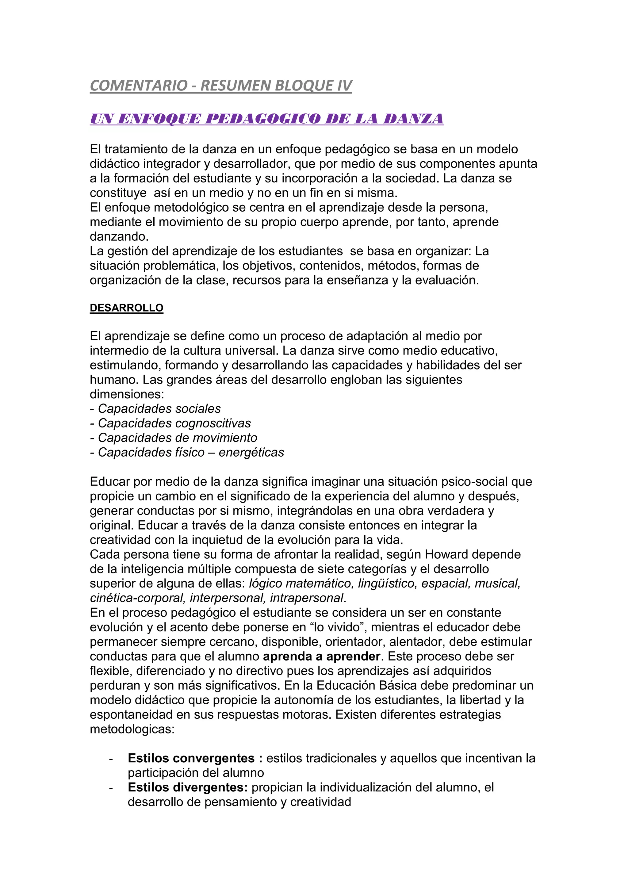 Este documento describe un enfoque pedagógico de la danza que se basa en un modelo didáctico integrador y desarrollador. La danza se utiliza como un medio para formar al estudiante y prepararlo para la sociedad, no como un fin en sí misma. El aprendizaje se centra en el movimiento del propio cuerpo del estudiante. El proceso de enseñanza involucra organizar objetivos, contenidos, métodos y formas de evaluación. La danza sirve para estimular y desarrollar las capacidades cognitivas, sociales