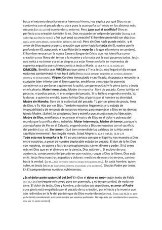1) El documento discute la importancia de María en la fe cristiana y los cuatro dogmas marianos principales. 2) Explica que María, al ser llena de gracia, no podía pecar y fue virgen y asunta al cielo. 3) Argumenta que María aceptó voluntariamente la muerte de Jesús con fe, perdón y paz total y es un modelo a seguir de sacrificio y renuncia de uno mismo.