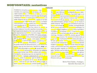 El documento discute la morfosintaxis en el texto, incluyendo el uso de sustantivos, complementos del nombre, verbos en indicativo como el imperfecto, y formas no personales de verbos. También analiza los campos semánticos relacionados con la navegación, el combate, y la angustia. Finalmente, resume los recursos estilísticos más notables.