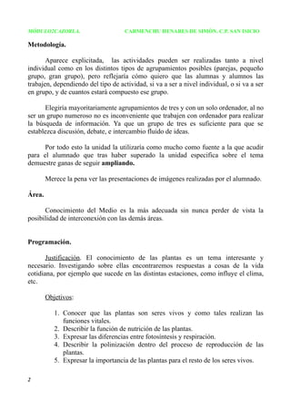 MÓDULO2CAZORLA. CARMENCHU HENARES DE SIMÓN. C.P. SAN ISICIO Metodología. Aparece explicitada, las actividades pueden ser realizadas tanto a nivel individual como en los distintos tipos de agrupamientos posibles (parejas, pequeño grupo, gran grupo), pero reflejaría cómo quiero que las alumnas y alumnos las trabajen, dependiendo del tipo de actividad, si va a ser a nivel individual, o si va a ser en grupo, y de cuantos estará compuesto ese grupo. Elegiría mayoritariamente agrupamientos de tres y con un solo ordenador, al no ser un grupo numeroso no es inconveniente que trabajen con ordenador para realizar la búsqueda de información. Ya que un grupo de tres es suficiente para que se establezca discusión, debate, e intercambio fluido de ideas. Por todo esto la unidad la utilizaría como mucho como fuente a la que acudir para el alumnado que tras haber superado la unidad especifica sobre el tema demuestre ganas de seguir ampliando. Merece la pena ver las presentaciones de imágenes realizadas por el alumnado. Área. Conocimiento del Medio es la más adecuada sin nunca perder de vista la posibilidad de interconexión con las demás áreas. Programación. Justificación. El conocimiento de las plantas es un tema interesante y necesario. Investigando sobre ellas encontraremos respuestas a cosas de la vida cotidiana, por ejemplo que sucede en las distintas estaciones, como influye el clima, etc. Objetivos: 1. Conocer que las plantas son seres vivos y como tales realizan las funciones vitales. 2. Describir la función de nutrición de las plantas. 3. Expresar las diferencias entre fotosíntesis y respiración. 4. Describir la polinización dentro del proceso de reproducción de las plantas. 5. Expresar la importancia de las plantas para el resto de los seres vivos. 2