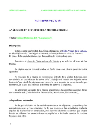 MÓDULO2CAZORLA. CARMENCHU HENARES DE SIMÓN. C.P. SAN ISICIO ACTIVIDAD Nº1 (3-03-10) ANÁLISIS DE UN RECURSO DE LA MOCHILA DIGITAL Título: Unidad Didáctica 2.0: "Las plantas”. Descripción. Estamos ante una Unidad didáctica perteneciente al CEPr. Virgen de la Cabeza, de Motril (Granada). Va dirigida a alumnas y alumnos de tercer ciclo de Primaria. El título de la unidad didáctica nos da una idea del contenido de esta. Pertenece al Área de Conocimiento del Medio y va referida al tema de las Plantas. La página, que se encuentra sobre un fondo claro, casi blanco, presenta varios apartados. Al principio de la página no encontramos el título de la unidad didáctica, sino que el título es “Actividades del tercer ciclo”. Debajo está situada una delgada barra horizontal que divide la página en dos partes, la parte superior de menor tamaño que la inferior, en la que está incluido el nombre del centro a la izquierda. En el margen izquierdo de la página, encontramos las distintas secciones de las que consta la web (Guía didáctica, Presentación, Actividades, Recursos,etc.). Adaptaciones necesarias. En la guía didáctica de la unidad encontramos los objetivos, contenidos y las competencias que se van a trabajar. En lo que respecta a las actividades, incluiría algunas de iniciación y de ampliación, para aquellas alumnas y alumnos que tengan interés en afianzar los conocimientos o ampliarlos e incluiría recortes de revistas buscados por ellos. 1