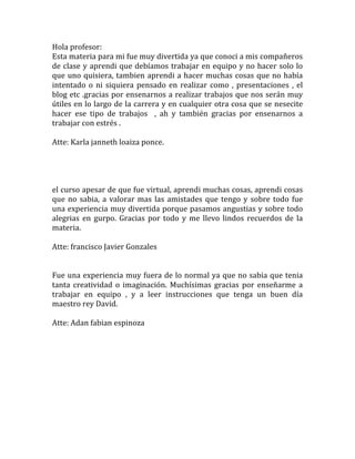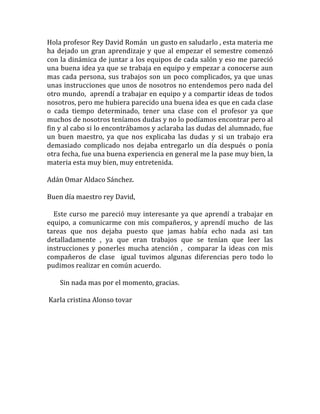 Varios estudiantes escriben al profesor Rey David para agradecerle por la clase. Aprendieron a trabajar en equipo, a comunicarse mejor con sus compañeros, y a realizar nuevos tipos de proyectos como presentaciones y blogs. Aunque algunos trabajos fueron complicados, el profesor siempre estuvo dispuesto a aclarar dudas.