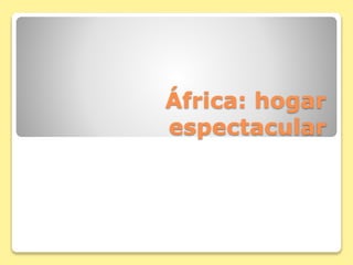 El documento describe las características de varios animales africanos, incluyendo elefantes que pesan hasta 7 toneladas, tigres solitarios que cazan en camadas de 1 a 6 crías, hienas carnívoras que dan a luz de 2 a 5 crías después de 84 días de gestación, e hipopótamos herbívoros que viven hasta 50 años y dan a luz una sola cría. También describe cebras herbívoras que pertenecen a la familia de los équidos.