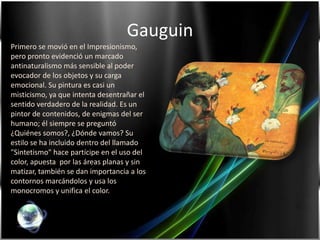 El documento resume las características estilísticas de tres pintores impresionistas: Gauguin exploró un estilo más simbólico y evocador conocido como sintetismo; Lautrec se centró en escenas de interiores iluminadas artificialmente usando técnicas mixtas de forma experimental; Monet fue el más puro impresionista, enfocándose en capturar la luz y atmósfera usando cortas pinceladas espontáneas.