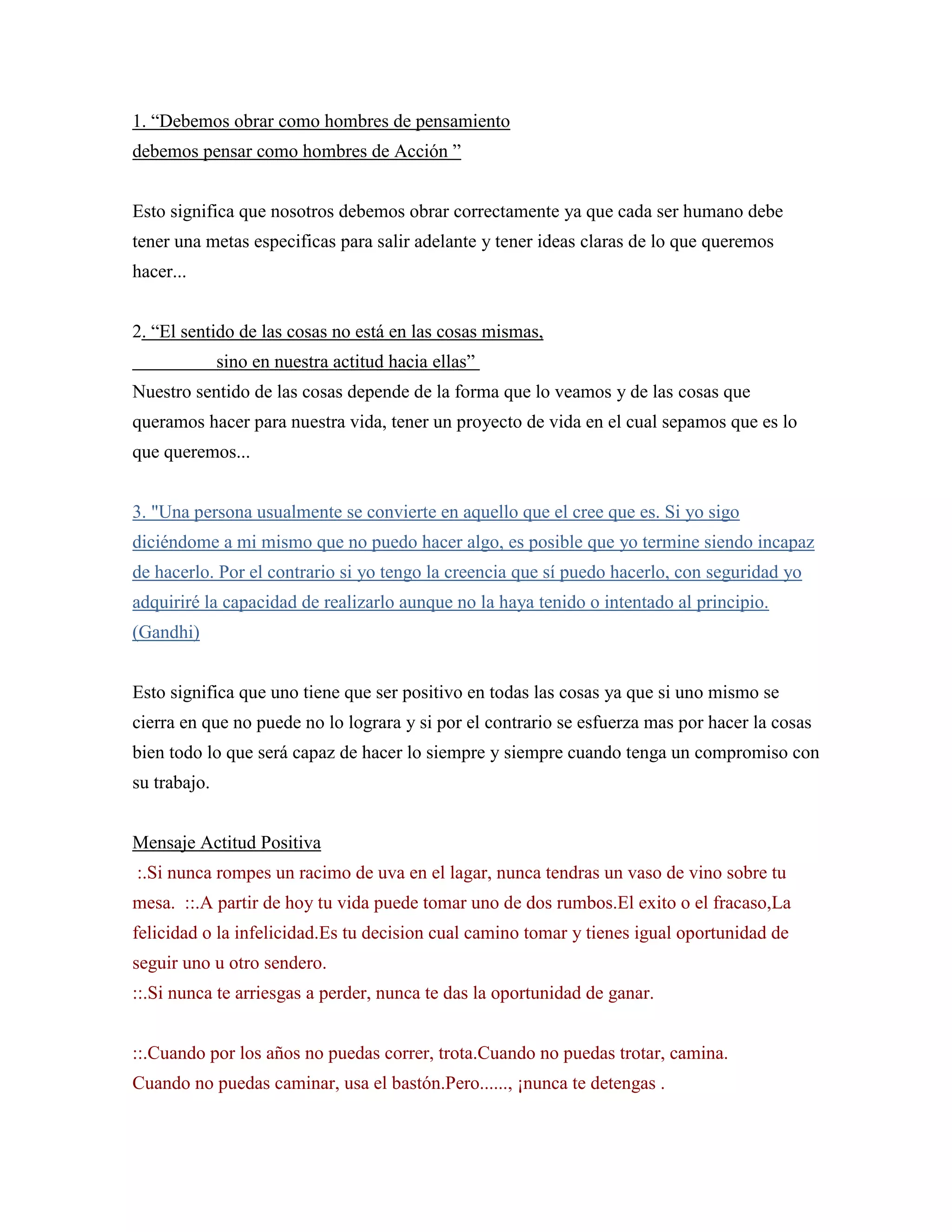 El documento presenta tres citas y un mensaje sobre la actitud positiva. La primera cita habla sobre la importancia de actuar con pensamiento y pensar con acción. La segunda cita señala que el significado de las cosas depende de nuestra actitud hacia ellas. La tercera cita de Gandhi indica que creemos que podemos lograr algo, es probable que lo logremos. El mensaje final enfatiza la necesidad de mantener una actitud positiva y esforzarse para alcanzar metas a pesar de los desafíos.