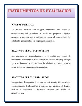 El documento describe diferentes técnicas e instrumentos de evaluación que pueden utilizarse para medir el aprendizaje de los estudiantes, incluyendo la observación, entrevistas, encuestas, pruebas objetivas, reactivos de opción múltiple y verdadero/falso, entre otros. El propósito es obtener información sobre el avance académico de los estudiantes y retroalimentar el proceso educativo.