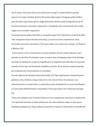 Este documento analiza los principales procedimientos humorísticos utilizados por la escritora puertorriqueña Ana Lydia Vega en sus cuentos. Estos incluyen la parodia, el error intelectual o acto fallido, el chiste tendencioso y el juego de palabras. Explica cada uno de estos elementos con ejemplos detallados de los cuentos de Vega. También discute las funciones del humor en su obra y cómo crea efectos de sorpresa y reflexión en el lector.