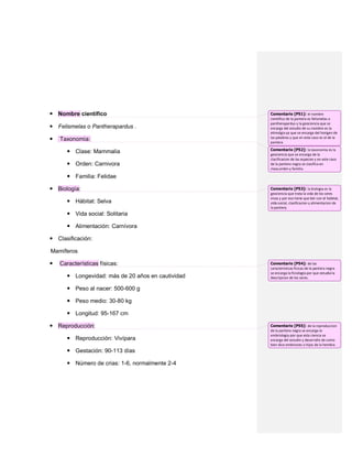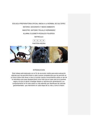Este documento describe la pantera negra, incluyendo su nombre científico, taxonomía, hábitat, vida social, alimentación, características físicas, reproducción y el comportamiento. También identifica las ciencias geoambientales relevantes como la biología, cartografía, zoografía, climatología, hidrogeología, zoobromatología, fisiología, etología y embriología y cómo cada una se relaciona con un aspecto de la vida de la pantera negra.