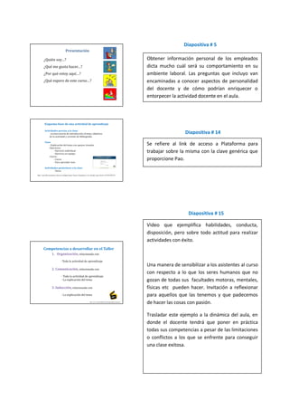 Este documento resume los comentarios y explicaciones de Carolina Madrigal sobre las diapositivas que incluyó en una presentación de formación de instructores en julio de 2009. Carolina proporciona detalles sobre las adiciones que hizo, como objetivos, videos, preguntas y definiciones, con el fin de mejorar la comprensión de los asistentes sobre temas como la relación maestro-alumno, las competencias docentes y la comunicación efectiva en el aula.