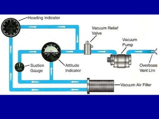 Los tres principales instrumentos giroscópicos en las aeronaves son el indicador de actitud, el coordinador de viraje y el indicador de rumbo. Estos instrumentos usan propiedades giroscópicas como la rigidez en el espacio y la precesión para mostrar la actitud y dirección de la aeronave. Los instrumentos pueden ser accionados por un sistema de vacío o eléctricamente. Es importante monitorear la presión del sistema de vacío durante el vuelo para asegurar la confiabilidad de las lecturas de los instrumentos girosc