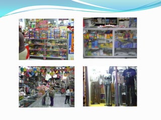El documento proporciona información sobre la tienda "Comercial Oriental" que ofrece una variedad de productos de primera necesidad, ropa, artículos de bazar y papelería. La tienda busca expandirse a través de una sucursal y entrega a domicilio. Su misión es satisfacer a los clientes de la mejor manera posible. Está estructurada con un gerente, asesor tributario y varias vendedoras. Sus clientes aprecian la diversidad de productos y su trato amable.