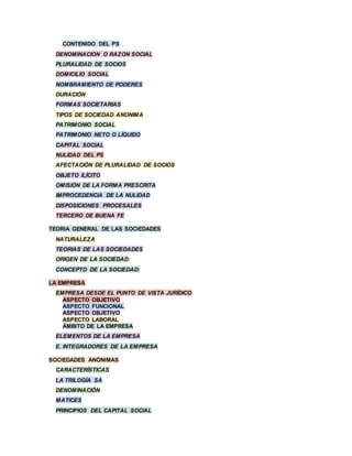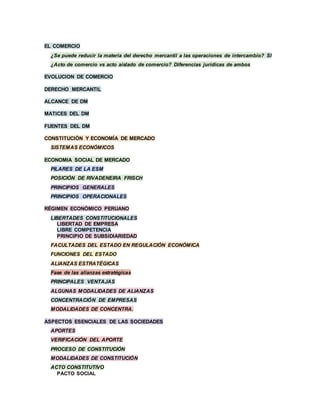 El documento trata sobre diversos temas relacionados al derecho mercantil como el comercio, las fuentes del derecho mercantil, los sistemas económicos como la economía social de mercado, las libertades económicas constitucionales como la libertad de empresa y libre competencia, las facultades regulatorias del estado, las sociedades mercantiles y conceptos como alianzas estratégicas. Explica conceptos clave del derecho mercantil y analiza el marco jurídico y económico peruano a la luz de estos temas.