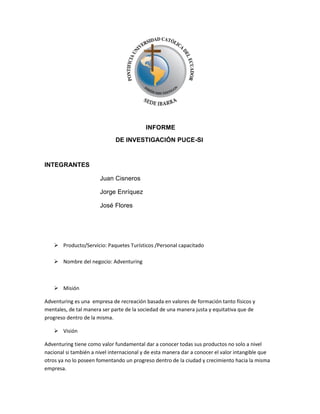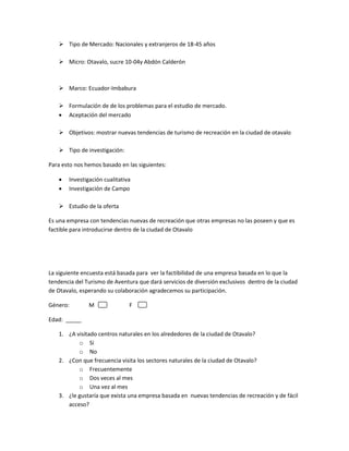 El documento presenta un informe de investigación de mercado realizado por tres integrantes para la empresa Adventuring, la cual ofrece paquetes turísticos y actividades de recreación. El informe describe la misión y visión de la empresa, su tipo de mercado objetivo, ubicación y el tipo de investigación cualitativa y de campo realizada para estudiar la factibilidad de introducir nuevas modalidades de turismo de aventura en la ciudad de Otavalo. Finalmente, incluye una encuesta aplicada a posibles clientes para conocer su interés y preferencias respecto a los servic