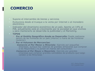 El documento describe los tipos y evolución del comercio interior y exterior en España. El comercio ha evolucionado desde el trueque a formas más modernas como Internet y el monedero electrónico. El comercio interior en España se divide en minorista y mayorista y se ve afectado por la competencia de grandes superficies. El comercio exterior español ha crecido desde la entrada en la UE y tiene una balanza comercial deficitaria basada en la exportación de productos industriales e importación de energía.