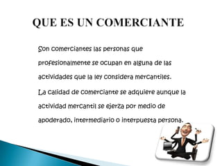 El documento define quiénes son considerados comerciantes según la ley y establece las reglas sobre quiénes pueden ejercer el comercio. Indica que son comerciantes aquellos que se dedican profesionalmente a actividades mercantiles definidas por la ley y que la capacidad para ejercer el comercio depende de la capacidad legal de una persona para contratar. También especifica los casos en los que se presume que una persona ejerce el comercio y quiénes están inhabilitados para hacerlo.