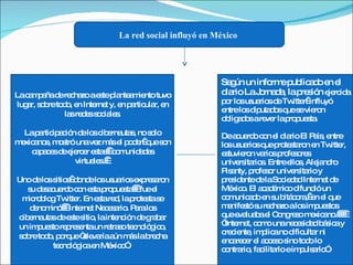 El documento habla sobre cómo las redes sociales, especialmente Twitter, influyeron en los diputados mexicanos para rechazar una propuesta de gravar con impuestos el acceso a Internet. Los usuarios de redes sociales expresaron su desacuerdo con la medida, lo que obligó a los diputados a revisar la propuesta. El documento también describe un sistema llamado Userful que permite que varios usuarios compartan los recursos de una sola computadora para ahorrar energía.