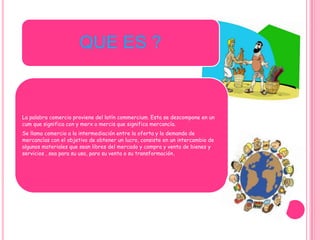 El comercio se refiere a la intermediación entre la oferta y la demanda de mercancías con el objetivo de obtener ganancias. Los participantes clave en el comercio son los compradores, que son las personas u organizaciones que demandan bienes o servicios, y los vendedores, que ofrecen dichos bienes y servicios. Existen dos tipos principales de comercio: el comercio interno, que ocurre dentro de las fronteras de un país, y el comercio externo, que involucra la exportación e importación de bienes entre países. Algun