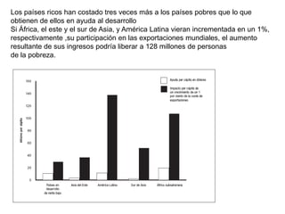 El documento discute temas relacionados con el comercio internacional y los pagos internacionales. Indica que los países ricos han costado tres veces más a los países pobres de lo que les han dado en ayuda, y que si los países en desarrollo aumentaran su participación en el comercio mundial en un 1%, esto podría sacar de la pobreza a 128 millones de personas. Además, explica conceptos como ventajas comparativas, teorías del comercio internacional, tipos de cambio, y la relación entre comercio exterior y demanda agregada.