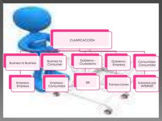 El comercio electrónico se define como cualquier transacción comercial en la que un proveedor y un cliente interactúan electrónicamente para intercambiar bienes o servicios a cambio de pago, sin contacto físico directo. Consiste en la compra y venta de productos o servicios a través de medios electrónicos como Internet. Incluye procesos de venta y compra entre proveedores y clientes que se canalizan a través de redes electrónicas.