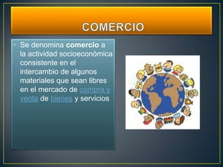 El documento habla sobre el comercio y su evolución a través del tiempo. Inicialmente, las personas intercambiaban bienes directamente a través del sistema de trueque. Luego, se comenzaron a utilizar metales preciosos como moneda, dando origen al dinero y los bancos. Finalmente, el comercio se convirtió en una actividad esencial tanto a nivel nacional como internacional, requiriendo el cambio de divisas y considerar las tasas de cambio.