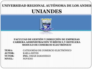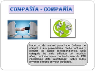 Este documento describe cuatro categorías principales de comercio electrónico: B2B, que se refiere a transacciones entre empresas; B2C, que se refiere a la venta minorista en línea a consumidores; B2G, que se refiere a transacciones entre empresas y el gobierno; y G2C, que se refiere a interacciones electrónicas entre el gobierno y los ciudadanos, como pagos de asistencia social y devoluciones de impuestos. El documento explica brevemente cada categoría y concluye que el com