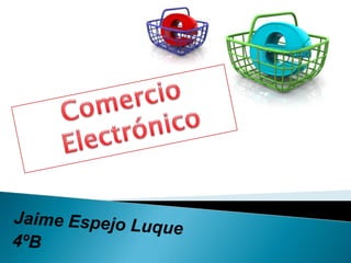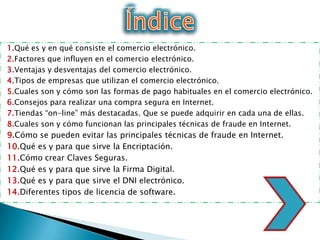Este documento trata sobre el comercio electrónico. Explica conceptos como qué es el comercio electrónico, factores que lo influyen, ventajas y desventajas, tipos de empresas que lo utilizan y formas de pago. También cubre consejos para compras seguras en Internet, tiendas online populares, técnicas de fraude y cómo evitarlas. Por último, explica conceptos de seguridad como encriptación, firmas digitales y el DNI electrónico.