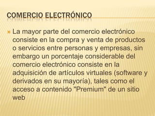 El documento describe varios temas relacionados con el comercio electrónico y el gobierno electrónico. Explica que el comercio electrónico involucra la compra y venta de productos o servicios a través de Internet u otras redes. También describe diferentes tipos como B2B, B2C, C2C. Luego discute conceptos como e-learning, e-government, y ventajas y desventajas de estas tecnologías.