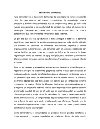 El documento describe el comercio electrónico, cómo ha avanzado con el tiempo permitiendo realizar transacciones y negocios en línea. Explica que ofrece beneficios para vendedores y compradores como acceso a mercados globales y variedad de productos respectivamente. También cubre los sujetos involucrados como empresarios, proveedores de internet y consumidores, y cómo la tecnología continúa mejorando esta forma de comercio.