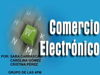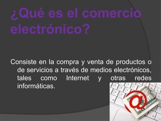 El documento describe el comercio electrónico, incluyendo su historia, ventajas, tipos (B2B, B2C, B2A, B2E, C2C, C2G, B2G), usos, seguridad, factores de éxito y ejemplos de tiendas como Sagi Sports y La Boutique de la Fruita. Explica que el comercio electrónico involucra la compra y venta de productos o servicios a través de Internet u otras redes y ha evolucionado desde la transferencia de fondos en la década de 1970.