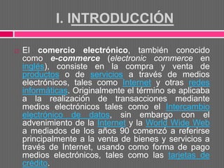 El documento discute los problemas legales y beneficios del comercio electrónico. Explica que el comercio electrónico ha evolucionado desde la venta por catálogo hasta las transacciones en línea actuales. También analiza las leyes peruanas relacionadas con el comercio electrónico y los desafíos jurídicos que plantea, como la validez de los contratos electrónicos. Finalmente, señala algunos beneficios del comercio electrónico para las empresas, como reducir costos e inventarios.