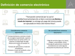 El documento define el comercio electrónico como transacciones comerciales realizadas a través de Internet, abarcando distintos tipos de compras y reservas en línea. Se enfoca en estudiar a compradores en línea en Lima, de 18 años o más, con el objetivo de conocer sus hábitos de compra y las preferencias de tiendas virtuales. El estudio incluye perfiles de compradores, medios de pago, y logísticas, y ofrece un informe integral con análisis segmentado y tablas estadísticas.