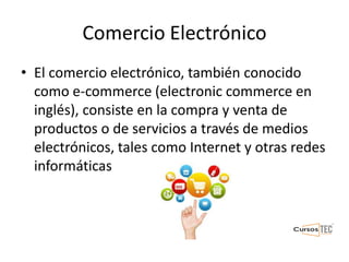 El comercio electrónico, o e-commerce, es la compra y venta de productos y servicios a través de internet, ofreciendo ventajas como bajo capital inicial y costos operativos reducidos. Los emprendedores pueden vender productos físicos, digitales o servicios mediante su propia tienda virtual o plataformas como Mercado Libre. El éxito en este mercado se basa en estratégias de marketing digital, investigación de mercado y un enfoque en la atención al cliente para construir una reputación sólida.