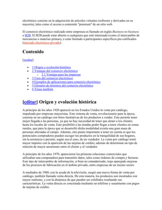 El documento habla sobre el comercio electrónico. Explica que consiste en la compra y venta de productos o servicios a través de medios electrónicos como Internet. También describe algunas ventajas como mejorar la distribución de productos, facilitar las comunicaciones comerciales y reducir costos operacionales. Además, explica que el comercio electrónico ha crecido mucho debido a la propagación de Internet y que se usa principalmente para transacciones entre empresas y entre empresas y consumidores.