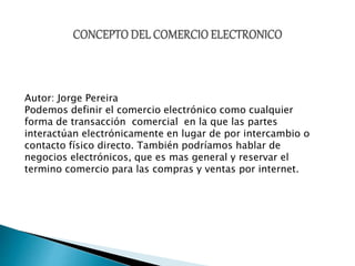 El documento resume la evolución del comercio electrónico desde las ventas por catálogo en los años 1920 hasta la creación de la World Wide Web en 1989 y el rápido crecimiento del comercio electrónico en la actualidad. Se describe el desarrollo de diferentes formas de comercio electrónico como la venta directa por televisión en los años 1960, el intercambio electrónico de datos en los 1970 y el surgimiento de Internet y la WWW en los 1980 y 1989.