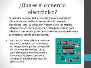 El comercio electrónico se define como la compra y venta de bienes y servicios a través de Internet. La ley mexicana protege a los consumidores en transacciones electrónicas y requiere que los sitios en línea muestren información sobre privacidad de datos, seguridad, contacto, descripción de productos, costos y formas de pago. Aunque el comercio electrónico ofrece ventajas como facilidad y rapidez, los consumidores a menudo dudan debido a incertidumbre sobre su funcionamiento.