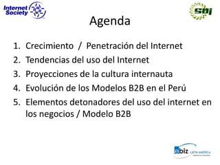 El documento habla sobre las oportunidades del comercio electrónico B2B para las empresas peruanas en el Perú y en el mundo. Explica que el uso de Internet ha crecido exponencialmente y se ha vuelto esencial para hacer negocios. También analiza las tendencias en el uso de redes sociales e Internet y proyecta que cada vez más personas de todas las edades usarán dispositivos móviles e Internet. Finalmente, destaca algunas iniciativas como la factura electrónica y el factoring que pueden ayudar a masificar el comercio