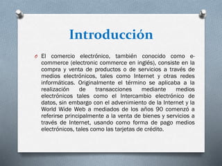 El documento define el comercio electrónico como cualquier actividad comercial que involucra a empresas interactuando y haciendo negocios a través de medios electrónicos. Se clasifica el comercio electrónico según los bienes/servicios (indirecto vs directo) y las partes involucradas en la transacción (empresa-empresa, empresa-consumidor, etc.). Se mencionan ventajas como acceso a nuevos mercados y facilidad de compra para clientes, así como desventajas como el mantenimiento de la tecnología requerida. Se concluye que