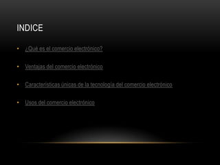 El documento habla sobre el comercio electrónico, definido como la compra y venta de productos o servicios a través de medios electrónicos como Internet. Explica las ventajas del comercio electrónico como mejoras en la distribución y comunicaciones comerciales, así como las características únicas de la tecnología como la ubicuidad y alcance global. Finalmente, detalla algunos usos comunes del comercio electrónico como la creación de nuevos canales de marketing y ventas.