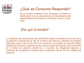 El estudio evalúa el uso de tecnologías de la información y la comunicación (TIC) en el consumo en Andalucía, revelando que el 45,8% de los internautas han comprado online en el último año. Los perfiles de los compradores destacan a jóvenes universitarios como los más activos, con una probabilidad significativa de compra entre hombres y mujeres con educación superior. Además, se abordan las preocupaciones de los consumidores sobre sus derechos en el comercio electrónico y las razones detrás de la resistencia a realizar compras en línea.