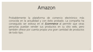 Este documento analiza varios comercios electrónicos exitosos como Amazon, Staples, Dell, eBay y ThinkGeek. Resalta cómo Amazon permite que otras personas vendan productos en su sitio y ofrece una gran variedad de productos propios. También destaca el diseño limpio y sencillo de Staples, su lista de categorías y envío gratis. Finalmente, señala que estos comercios electrónicos tienen diseños optimizados, gran variedad de productos, descuentos y protección al cliente.